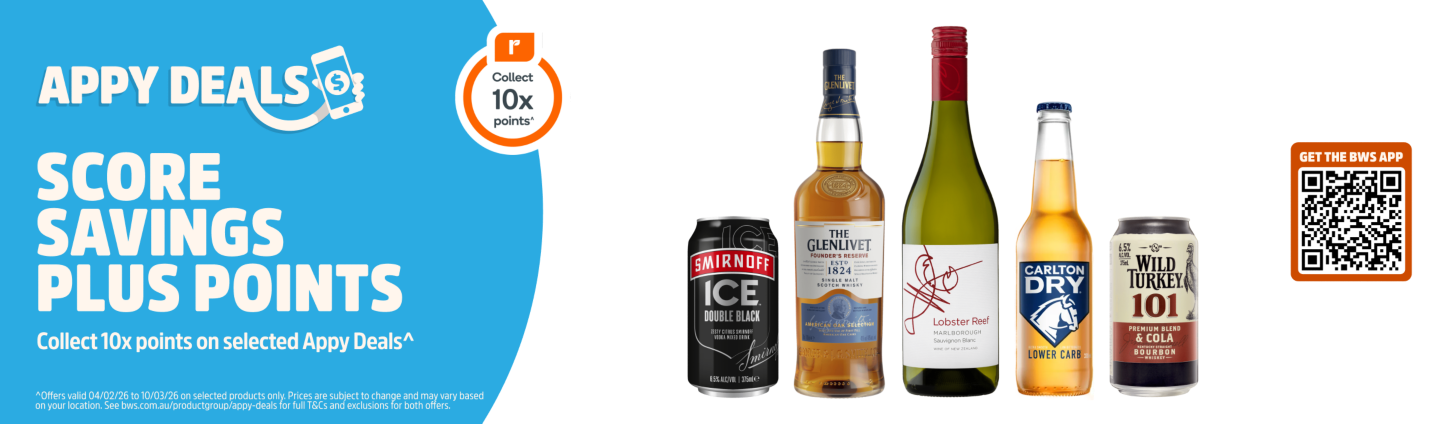 ^From 04/02/26 to 10/03/26 11.59pm AEDT, customers can earn 10x Everyday Rewards points on selected Appy Deal products, while stock lasts. This offer is available when you purchase via the BWS App with your registered Everyday Rewards Card linked, or when you shop in store by scanning the Appy Deals barcode in the BWS App and your Everyday Rewards Card at the counter. This offer is not available for purchases on Doordash. Appy Deals are not available on the BWS website. Prices are subject to change and may vary based on your location. Remember to set your location for accurate pricing. Redemption limits apply. See here for full terms and conditions of the 10x Everyday Rewards points.