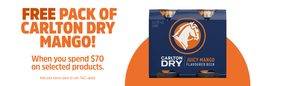 - Conditions apply. Spend $70 or more on selected products and receive a free pack of Carlton Dry Juicy Mango Flavoured Beer Cans 4x330mL. Available online only on selected products only. You must add the Carlton Dry Juicy Mango Flavoured Beer 4 pack to your cart to get the free product. Offer available from 13-17 Mar 2024 11:59pm (AEDT) or until gifts run out, whichever is first. Max 1 gift per person per transaction per day. Stock availability may vary by store. Excluding Northern Territory.