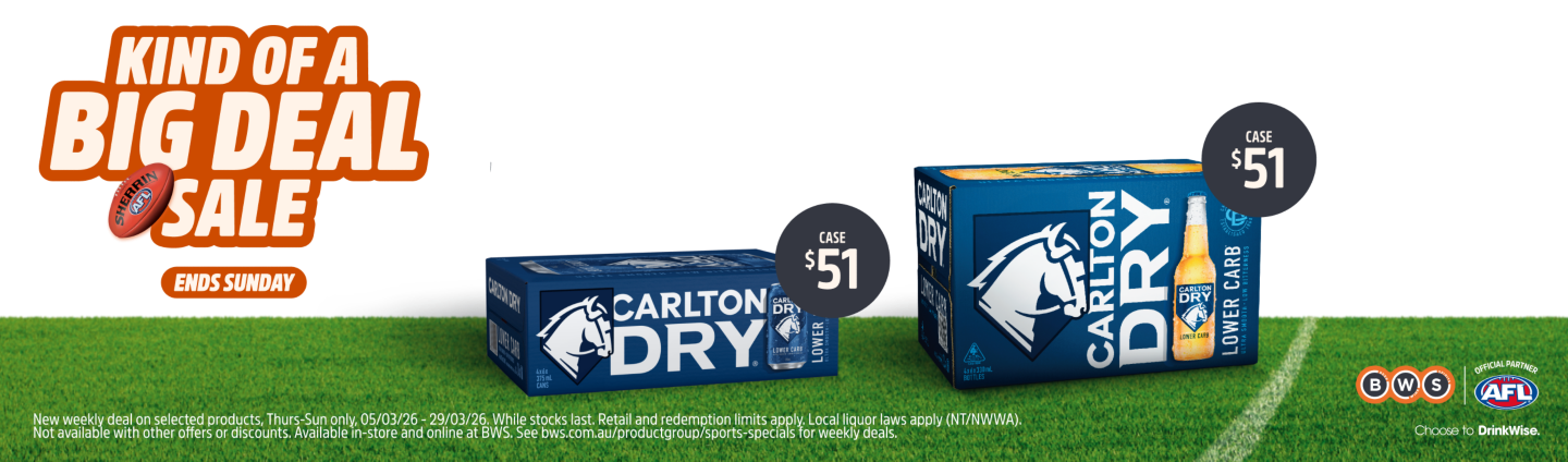 New weekly deal on selected products, Thurs-Sun only, 05/03/26 - 29/03/26. While stocks last. Retail and redemption limits apply. Local liquor laws apply (NT/NWWA). (Not available with other offers or discounts. Available in-store and online at BWS. See bws.com.au/productgroup/sports-specials for weekly deals.