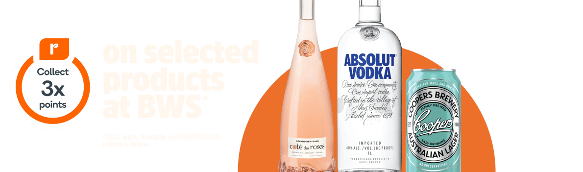 To collect 3x points, shop selected liquor products in a single transaction in-store or online at BWS and ensure you either scan your Everyday Rewards Card or that your registered Everyday Rewards Card number is linked to your online account before completing your transaction. 3x points equals 1 (one) standard point and 2 (two) additional points per dollar spent on products at BWS. Offer can be enjoyed one (1) time each day of the promotional period. Cannot be used in conjunction with any other offer. A full list of liquor products included in the offer can be found here. See here for full offer terms and conditions. In addition to the above terms and conditions, by participating in the Everyday Rewards program you agree to the Everyday Rewards Terms and Conditions.