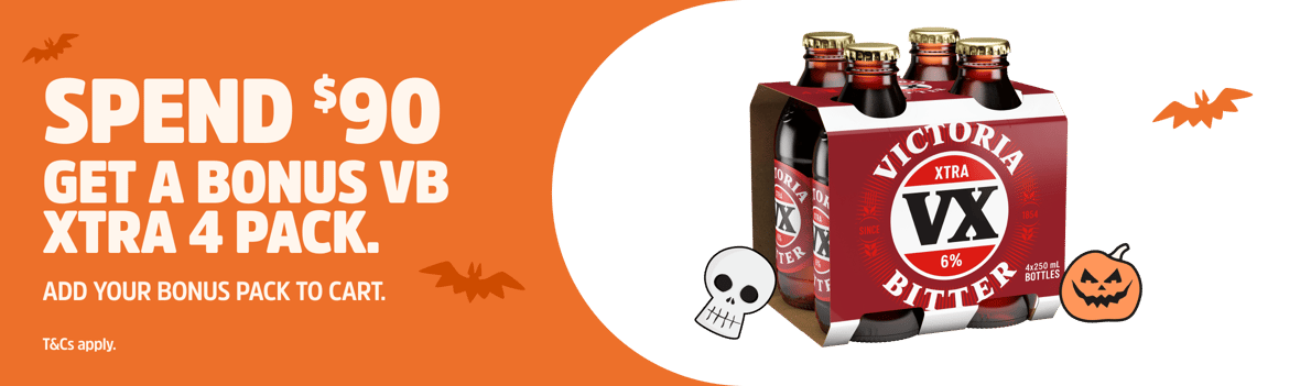 bws.com.au and receive a free 4 pack of Victoria Bitter Xtra. You must add the Victoria Bitter Xtra 4 pack to your cart to get the free product. Max 1 gift per person per transaction per day. Stock availability may vary by store. Excluding Northern Territory. While stocks last.