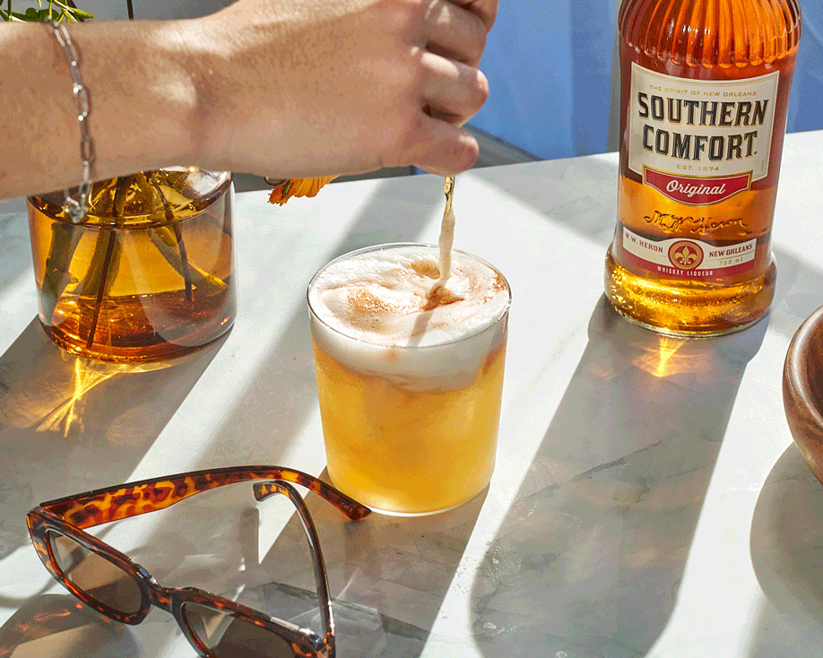 What makes a California sour, you ask? You’ll find zero egg whites in this bad boy. That’s right, it’s fully vegan. Peace, love and cocktails, man! Instead, this one gets its foam from Aquafaba (chickpea water!) Smooth Southern Comfort makes this sip like a dose of SoCal sunshine in a glass.